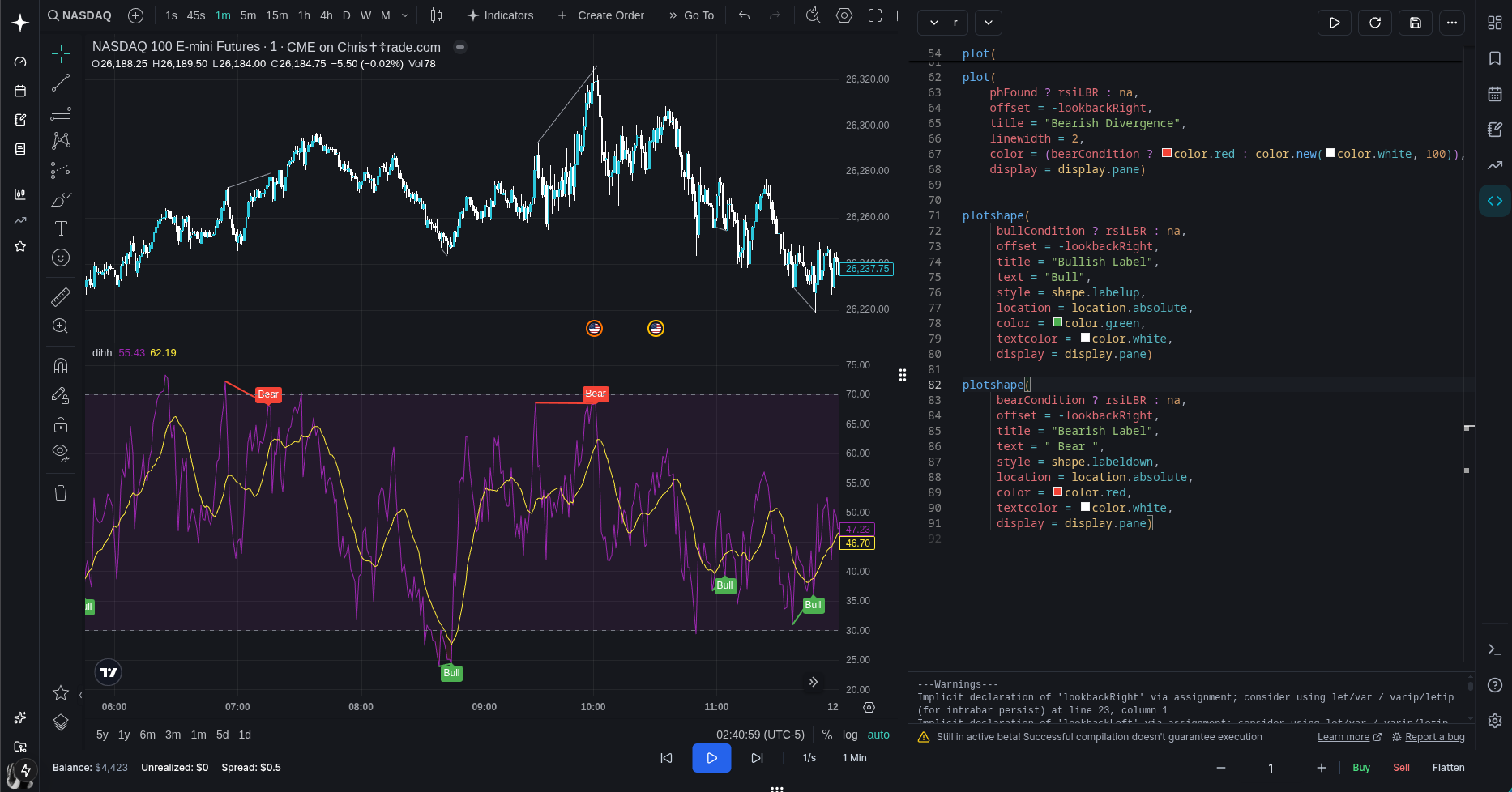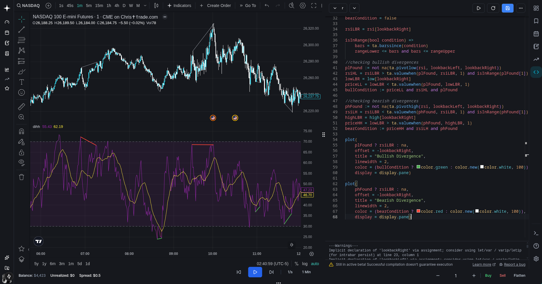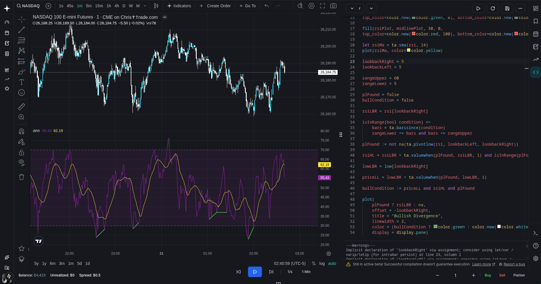 // how far to look to the right of a pivot. // right = future bars, so this basically delays confirmation lookbackRight = 5 // how far to look to the left of a pivot. // left = past bars, so this controls how "clean" the swing needs to be lookbackLeft = 5 // max bars between two pivots to still call it a divergence rangeUpper = 60 // min bars between two pivots (ignore tiny noise pivots 1-5 bars apart etc) rangeLower = 5 // did we just find an rsi pivot low on this bar plFound = false // final "yes/no" flag for bullish divergence bullCondition = false