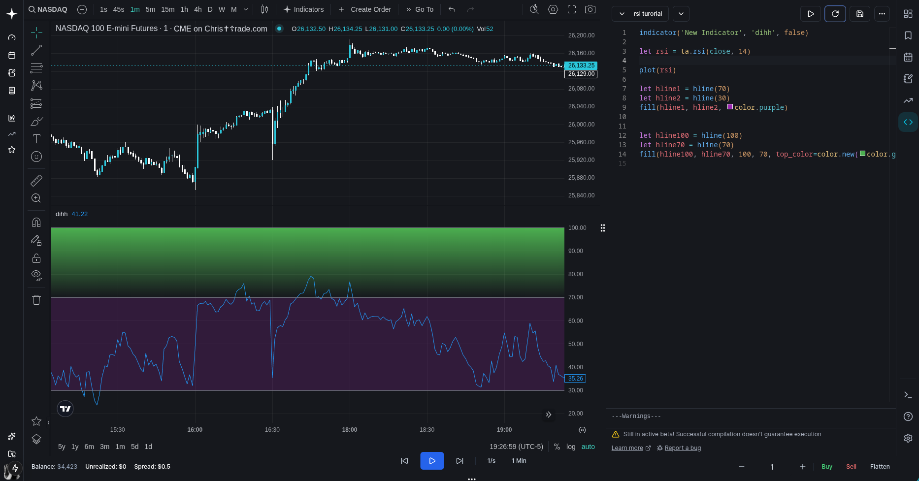 indicator('New Indicator', 'dihh', false) let rsi = ta.rsi(close, 14) let rsiPlot = plot(rsi, color=color.purple, linewidth=1) //added linestyle=hline.style_dashed to the bounds hlines let hline1 = hline(70, linestyle=hline.style_dashed) let hline2 = hline(30, linestyle=hline.style_dashed) fill(hline1, hline2, color.new(color.purple, 90)) let midlinePlot = plot(50, editable=false, display=display.none) fill(rsiPlot, midlinePlot, 100, 70, top_color=color.new(color.green, 0), bottom_color=color.new(color.green, 100))